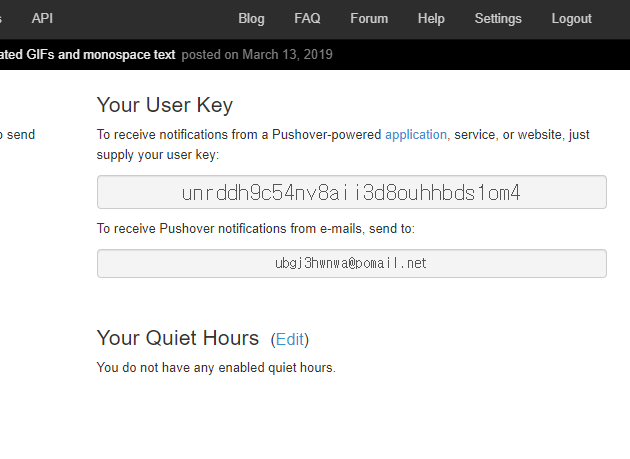 PushOver사이트가 가입하면 자동적으로 User Key가 발행된다.