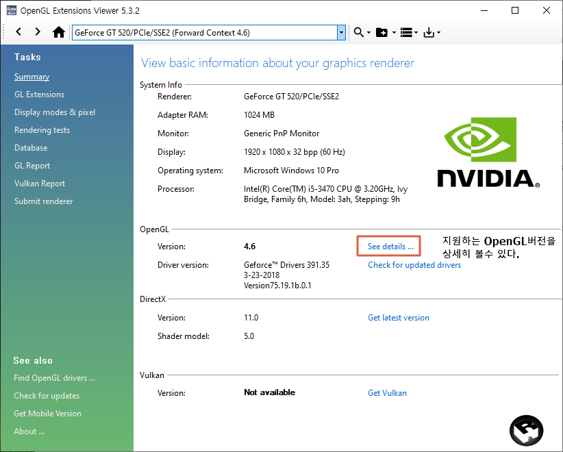확인방법은 OpenGL버전과 호환성 확인할수 있는 "OpenGL Extensions Viewer" 프로그램으로 확인이 가능합니다.