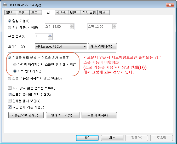 이때 한번 확인해볼수 있는건 프린터 설정에서 스풀 기능을 사용하지 않음으로 해놓았을 경우이다.