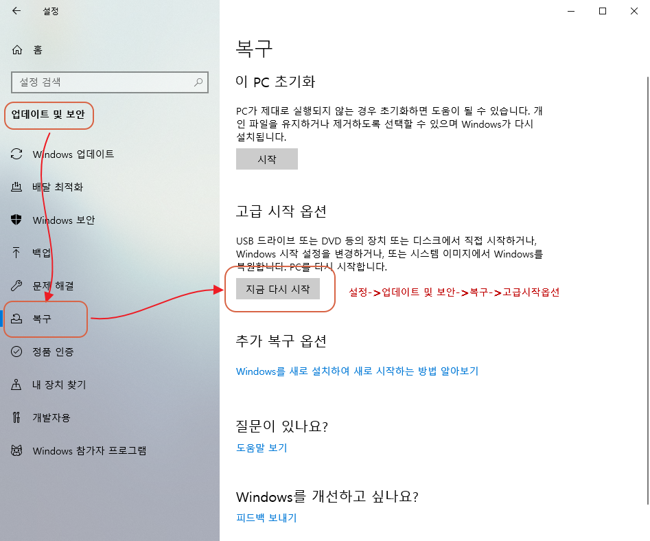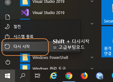 설정->업데이트 및 보안 -> 복구 -> 고급 시작 옵션 -> 다시시작