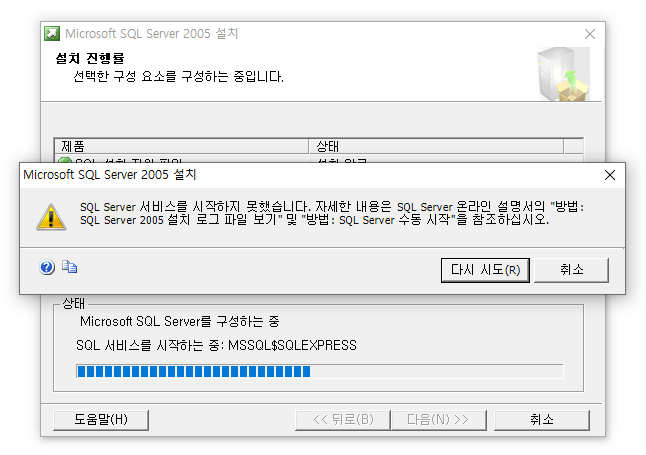 설치진행중 아래와 같은 오류메세지를 출력합니다. 진행상황을 그대로 둔체