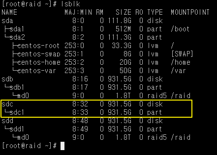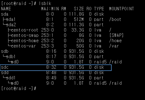 하드디스크를 교체후 하드디스크 구조를 확인하면 아래와 같이 /dev/sdc가 새로 장착되어 있는걸 볼수 있습니다.