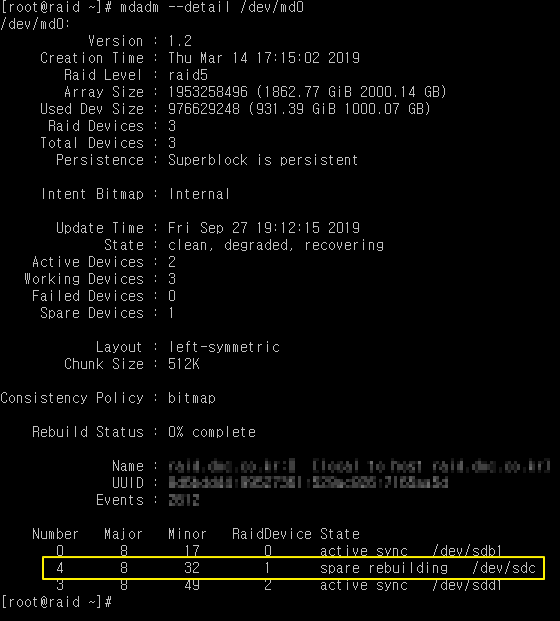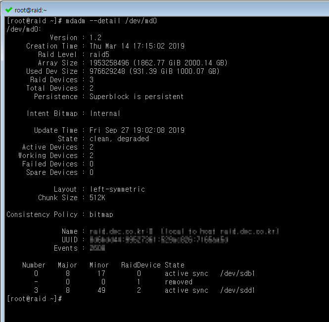 RaidDevice는 총 3개 1TB하드디스크중 두번째 하드디스크가 인식이 되지 않는걸 확인할수 있습니다.