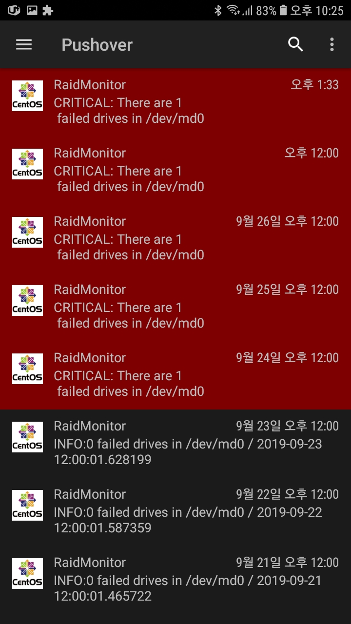 Pushover로 매일 정오에 "mdadm --detail /dev/md0" 실행해서 레이드 상태를 체크해서 메세지를 보내줍니다.