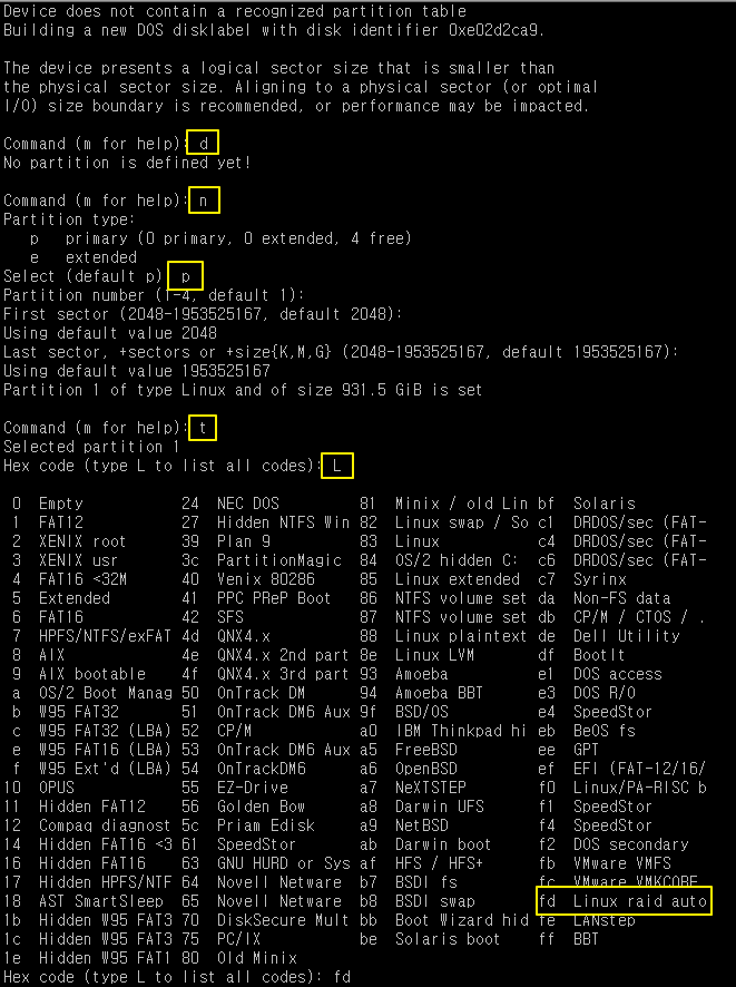 파티션 타입은 fd (Linux raid auto)로 설정