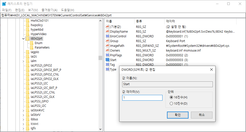 컴퓨터\HKEY_LOCAL_MACHINE\SYSTEM\CurrentControlSet\Services\i8042prt