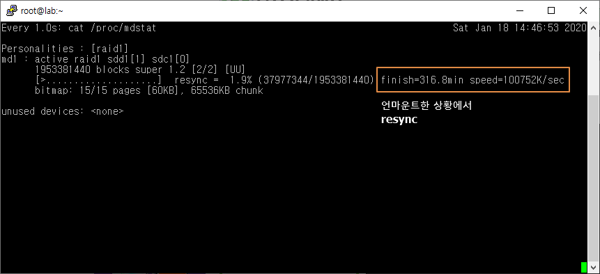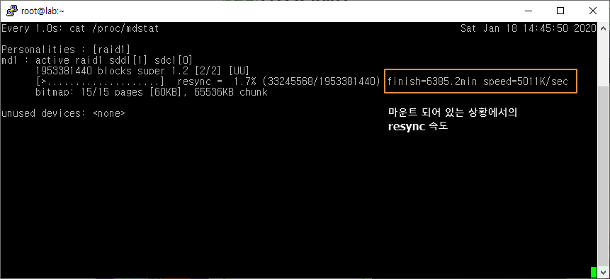 목차 반응형 mdadm으로 레이드를 생성후 resync작업할때 마운트 되어 있을경우 resync속도가 엄청 느립니다. resync는 umount후 하시는게 시간절약을 할수 있습니다. 아래는 raid1(2TB x 2) resync속도입니다. mount resync 마운트 되어 있는 상태에서 resync 속도 # umount /mnt/raid1 umount resync 언마운트 되어 있는 상태에서 resync 속도 공유하기 게시글 관리 동방노트 저작자표시 (새창열림) 목차 목차 닫기
