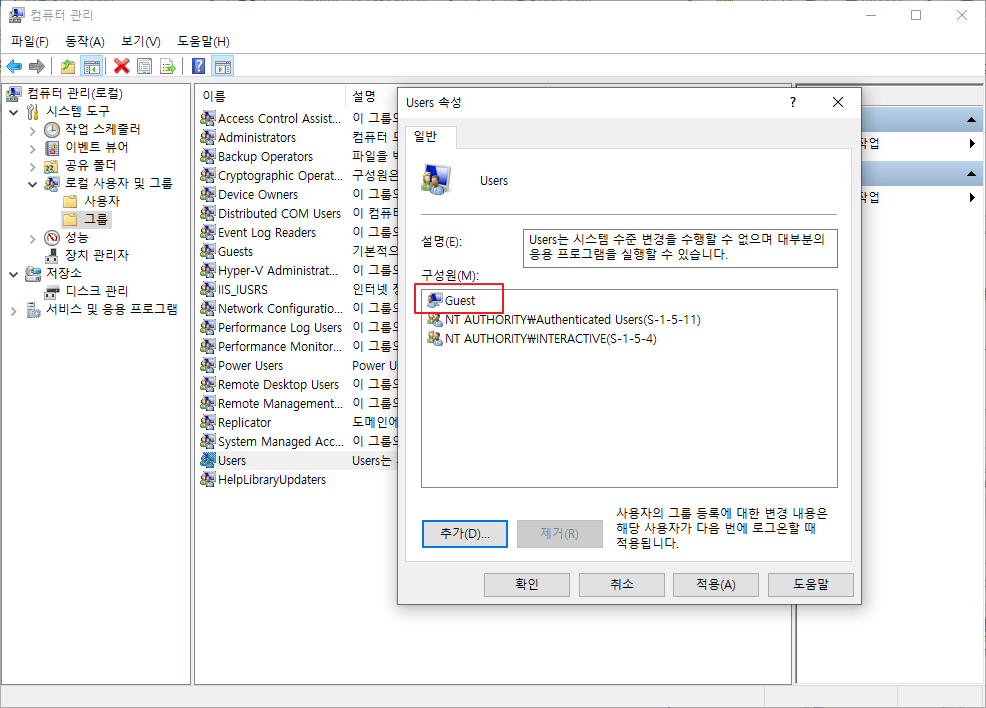 사용자 그룹 Users에 Guest를 추가 하는 방식입니다.
