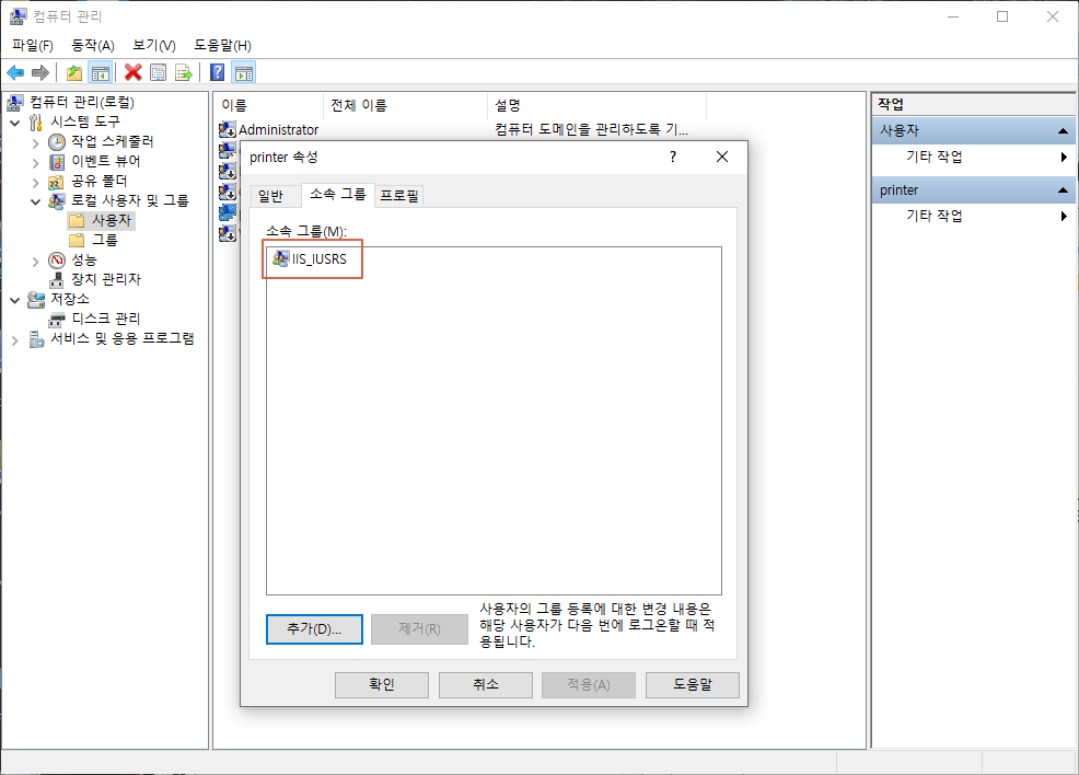이때 소속 그룹에서 USERS를 제거하고 IIS_USRS그룹으로 설정합니다.