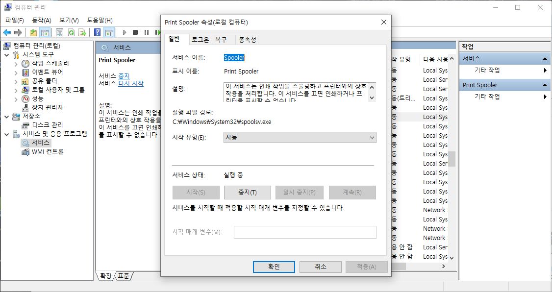 이때 보통 리부팅하거나, 서비스 -> Print Spooler를 다시시작하면 해결될수 있습니다.