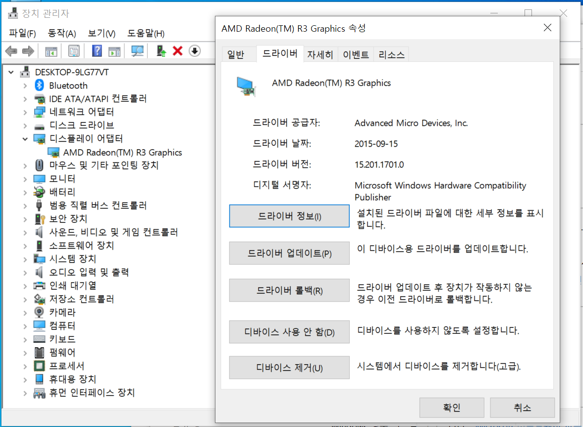 윈도우10 설치후 윈도우에서 자동으로 잡는 그래픽카드 드라이버를 설치될시