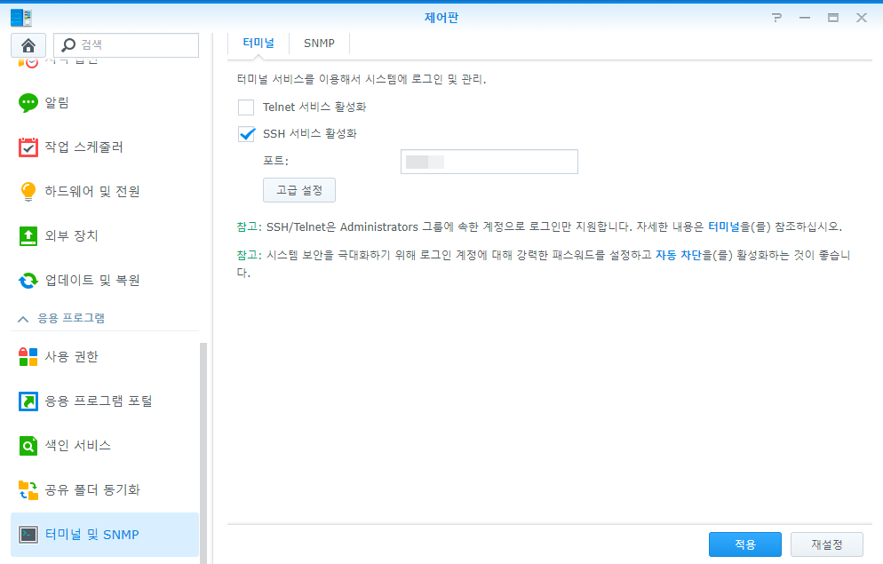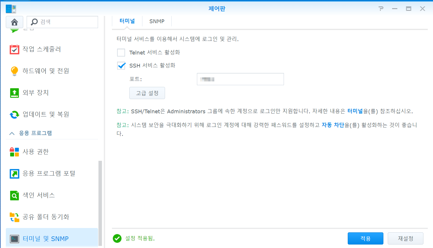 DSM제어판에서 활성화된sshd를 비활성화->활성화 하면 접속가능