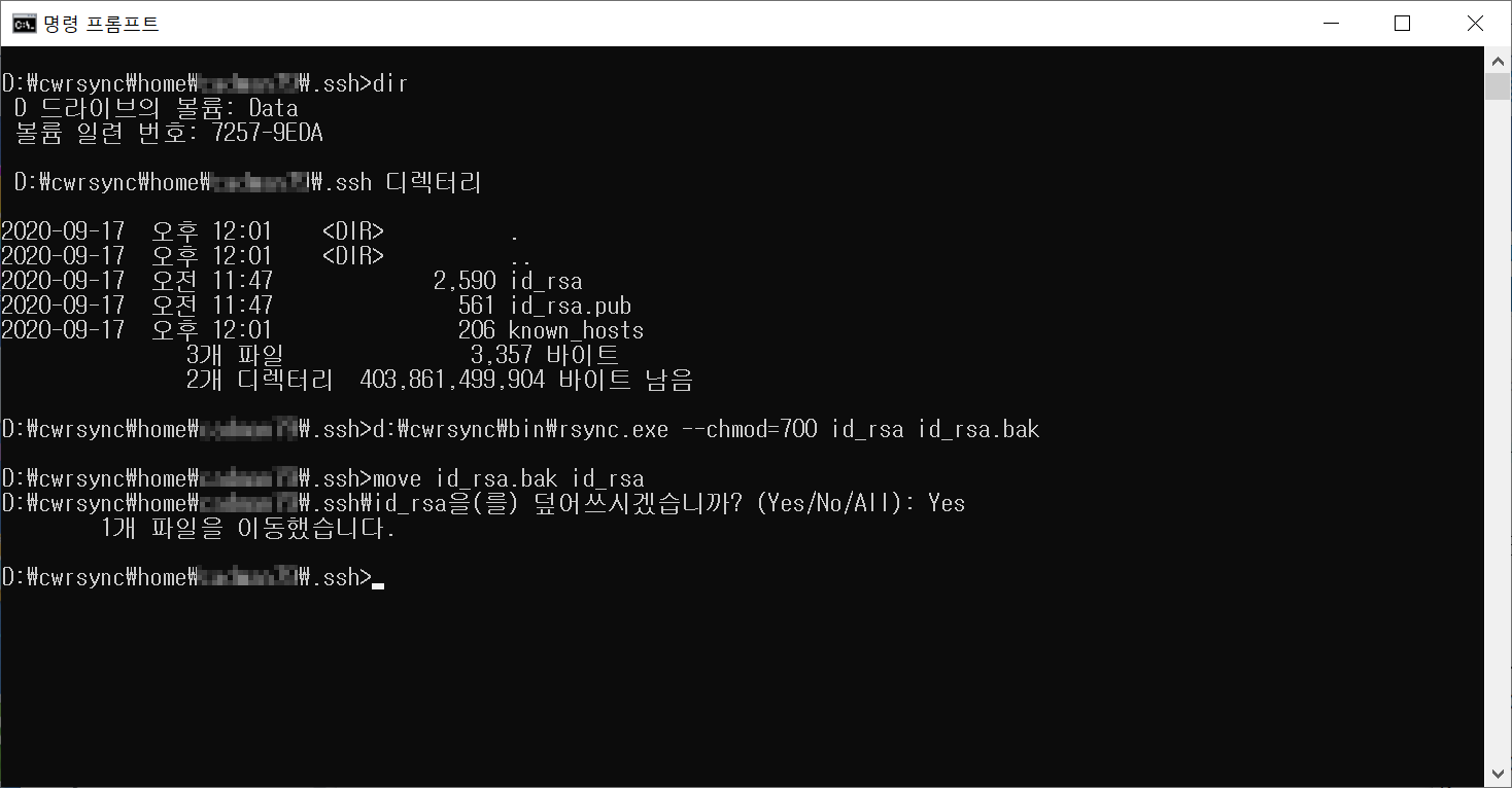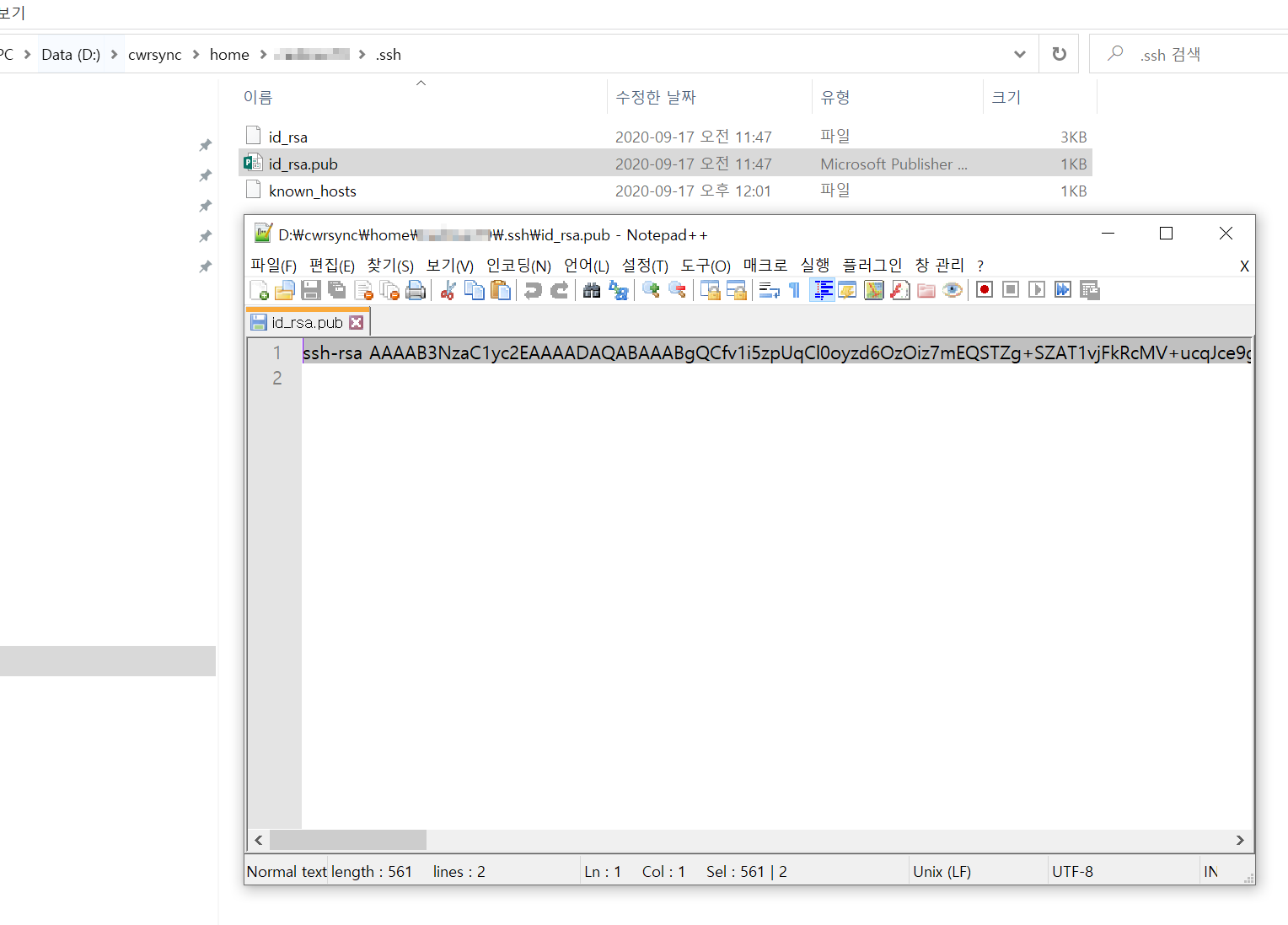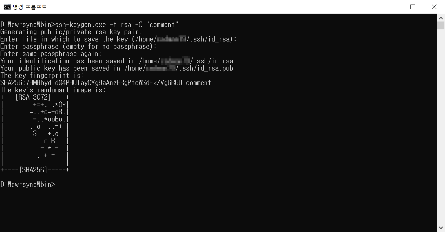d:\cwrsync\home\{사용자명}\.ssh\id_rsa : private key, 개인키
