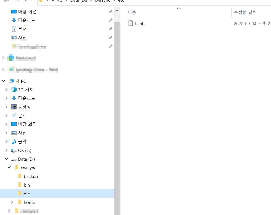 d:\cwrsync\etc\fstab 파일생성 및 작성