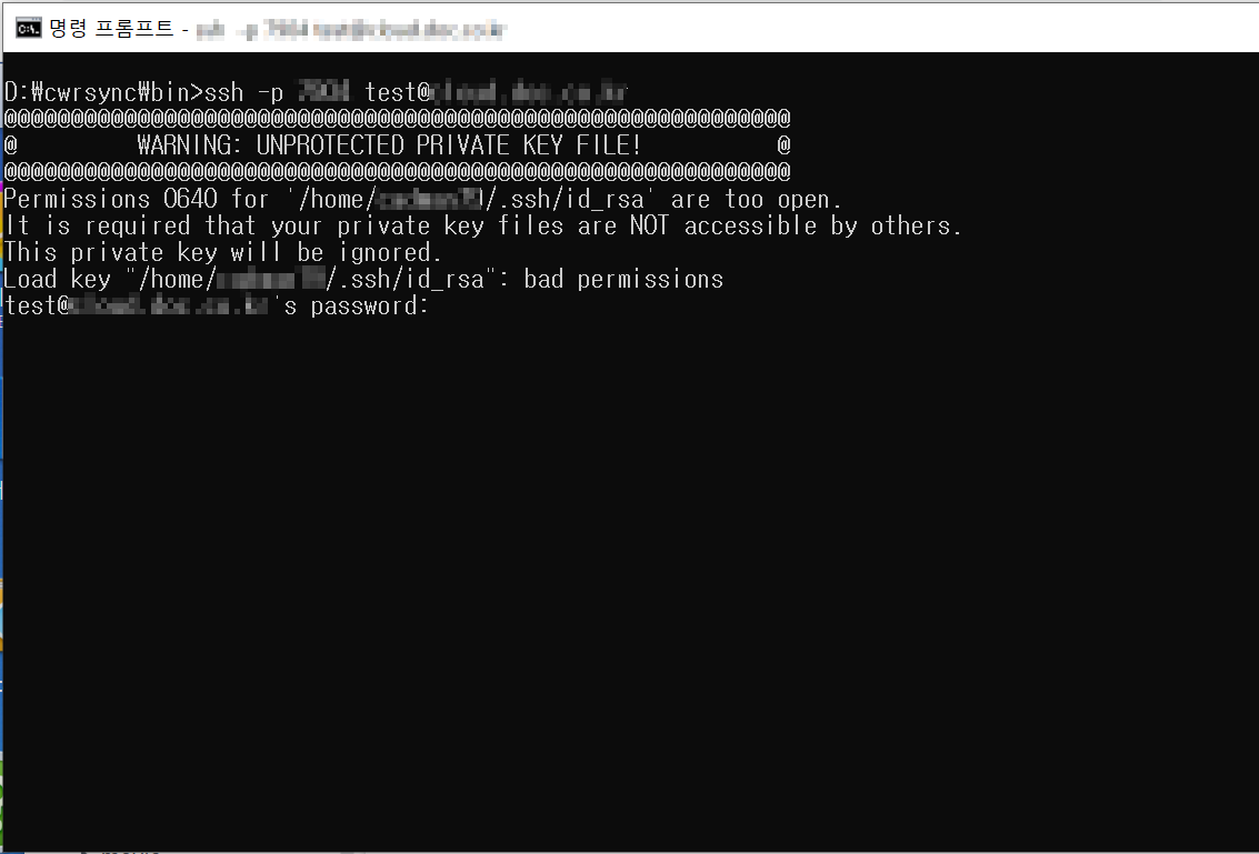 ssh 접속 테스트를 했을때 아래와 같이 권한문제가 발생해서 개인키 사용불가 메세지가 나옵니다.