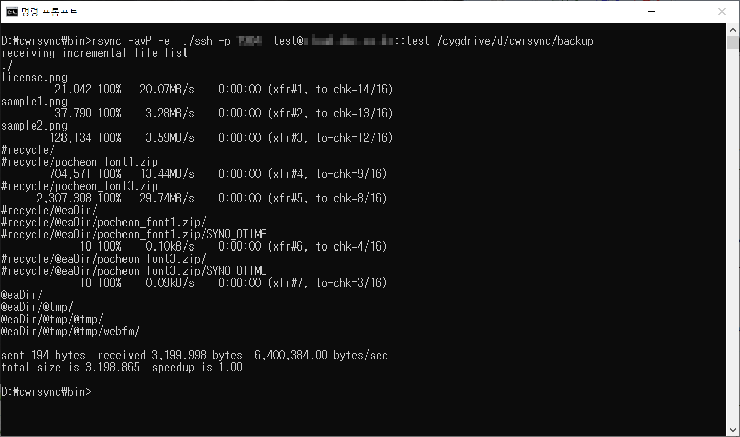 d:\cwrsync\bin\rsync -avP -e './ssh -p ssh포트' 시놀로지계정@도메인주소.com::공유폴더명 /cygdrive/d/cwrsync/backup