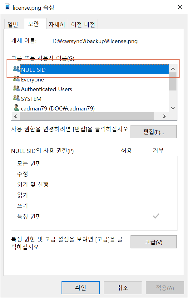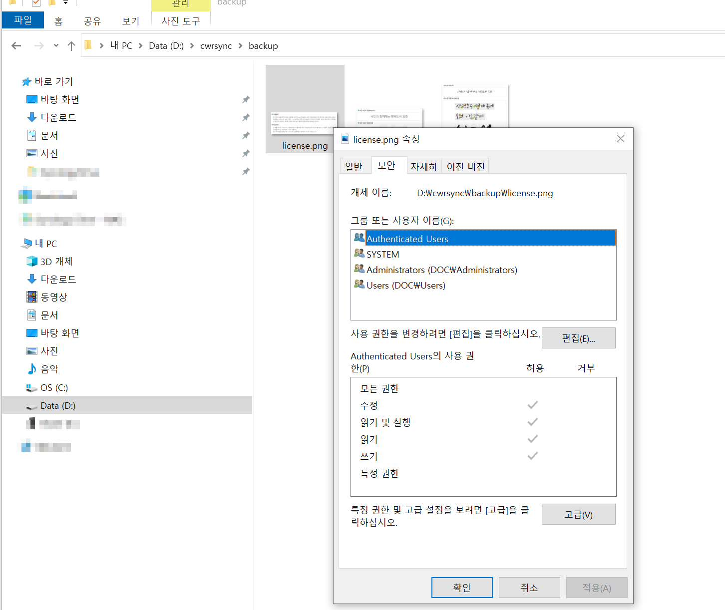 이때 해결방법은 윈도우권한으로 완전히 넘기면 해결이 됩니다.