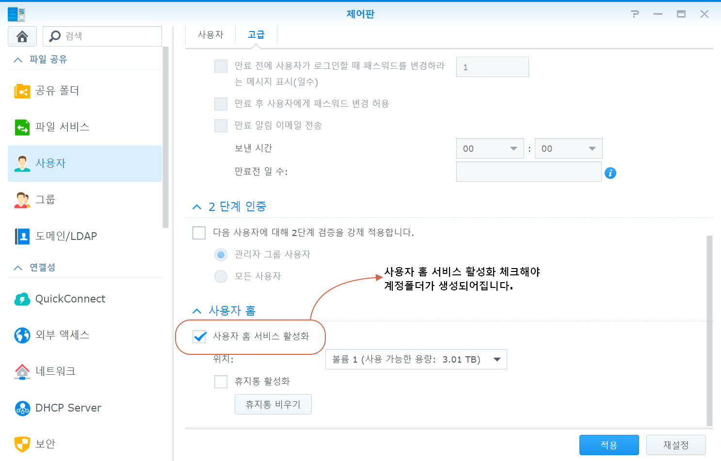계정별 홈폴더가 생성되도록 활성화 해야됩니다.