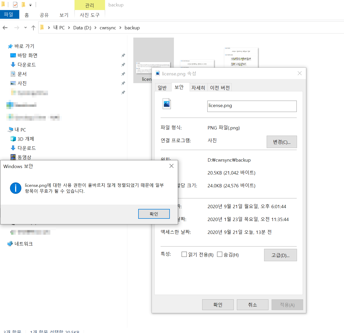 이때는 현재 사용자만 사용할수 있도록 권한을 변경해주면 해결할수 있습니다.