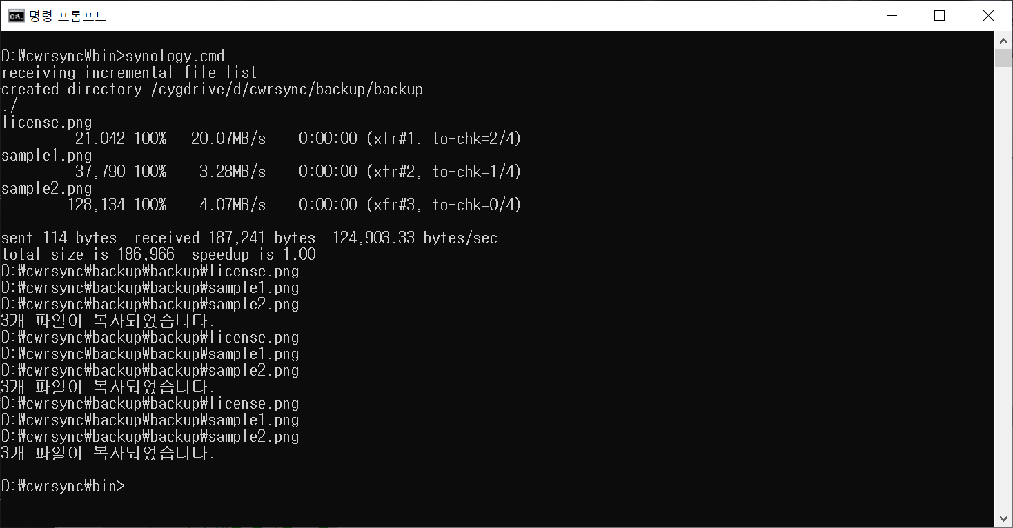 참고로 rsync 구문중에 /cygdrive/d/cwrsync/backup 을 d:\cwrsync\backup으로 구현이 가능합니다.