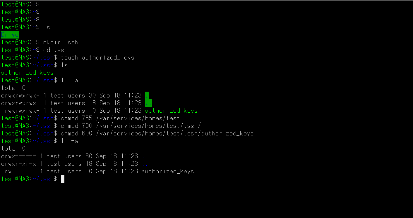# chmod 600 /var/services/homes/시놀아이디/.ssh/authorized_keys