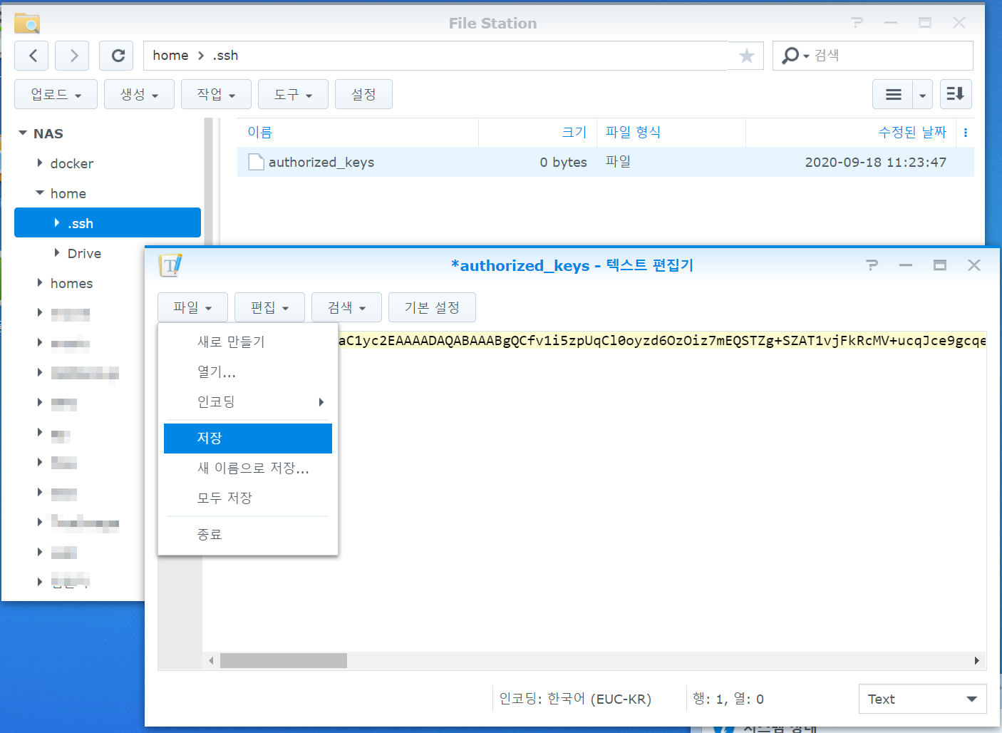 이 키값을 시놀로지 authorized_keys 넣어주면 됩니다.