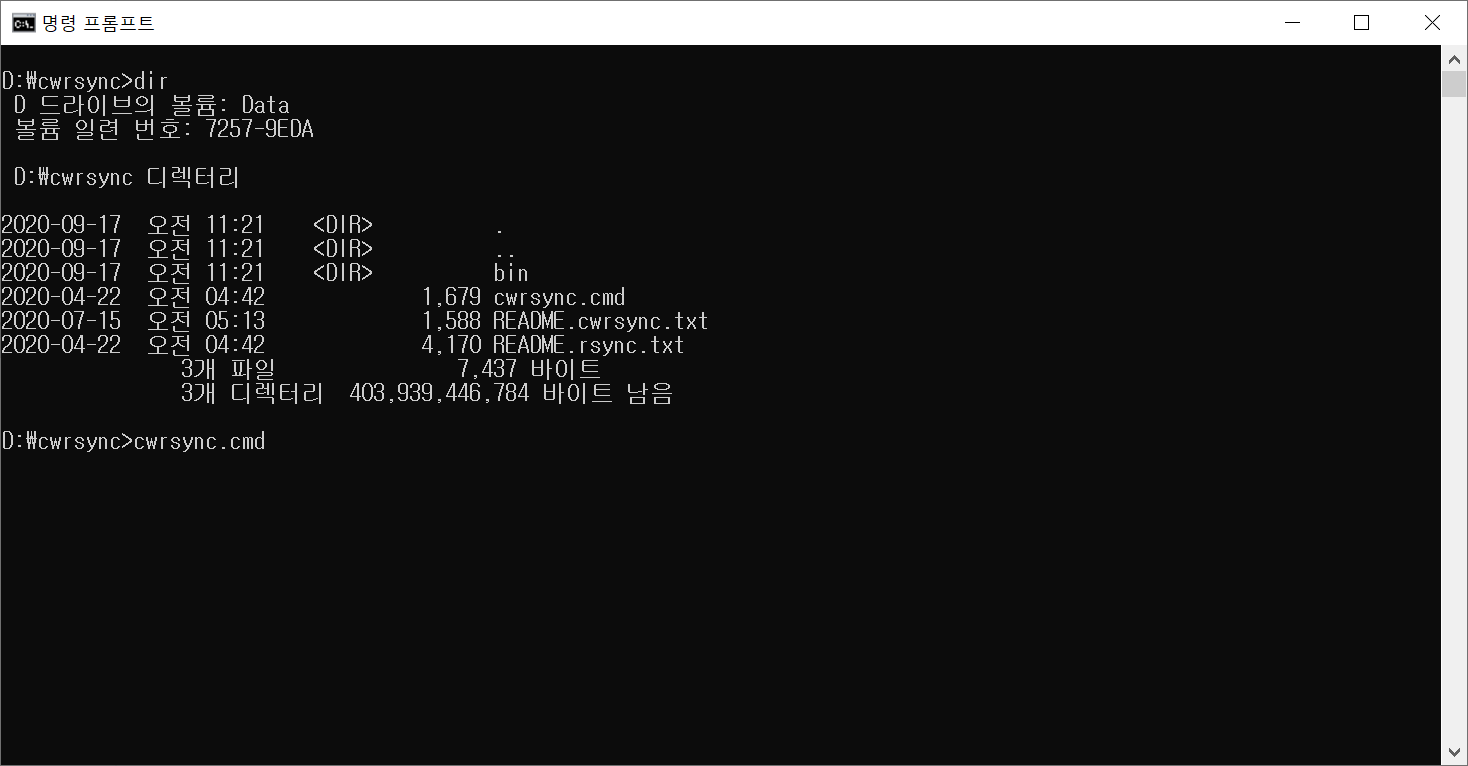 백업할 디스크에 압축을 푼후 아래와 같은 cwrsync.cmd 배치파일을 실행합니다.