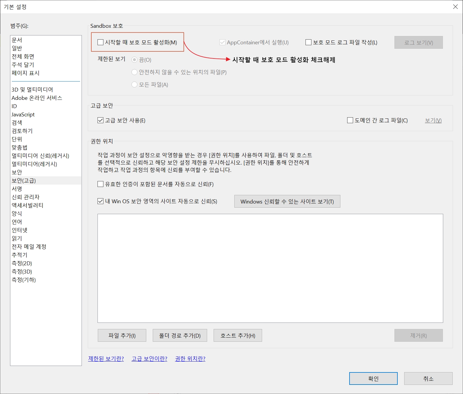 편집 -> 기본설정 -> 보안(고급) -> 시작할 때 보호 모드 활성화(M) 체크해제