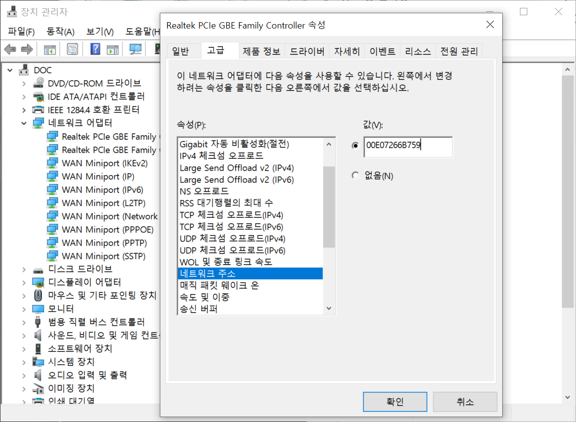 임시로 네트워크 맥 어드레스를 임의로 변경하면 정상작동합니다.