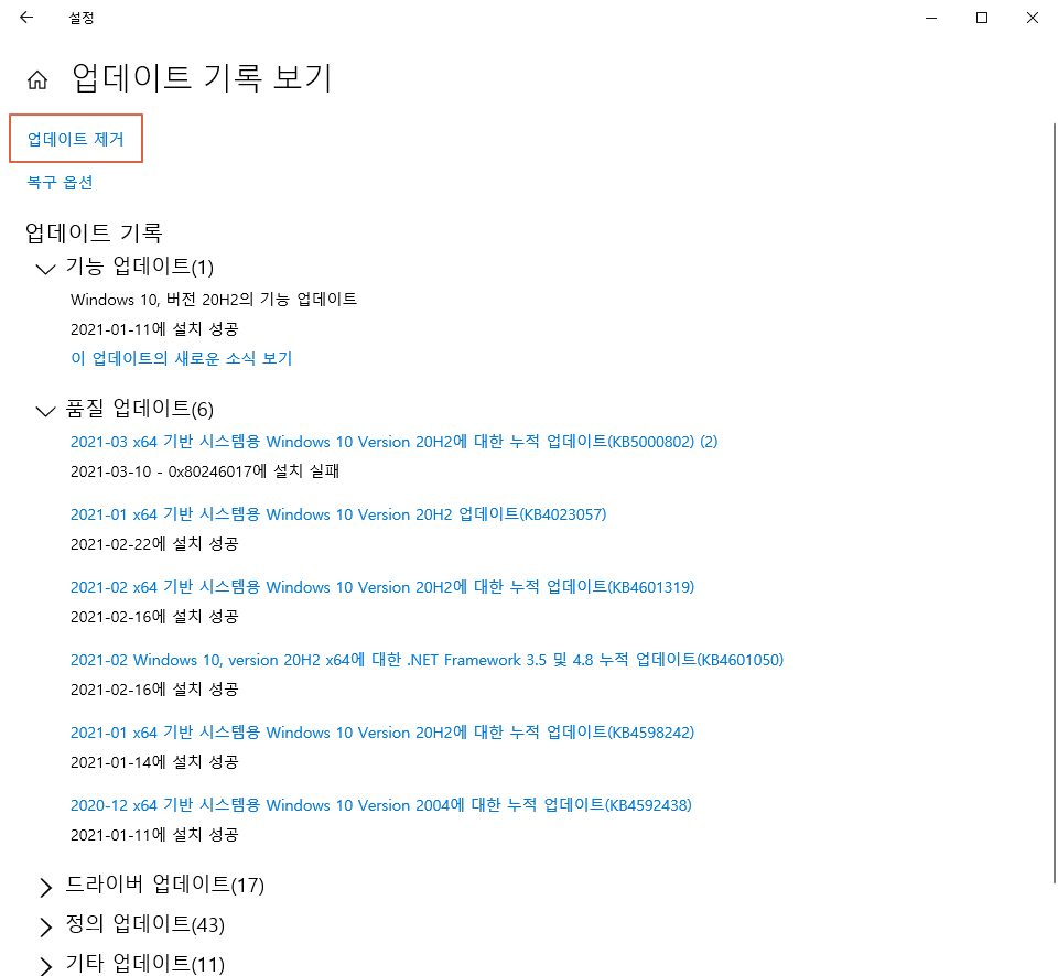 시작 -> 설정 -> 업데이트 및 보안 -> 업데이트 기록 보기 -> 업데이트 제거