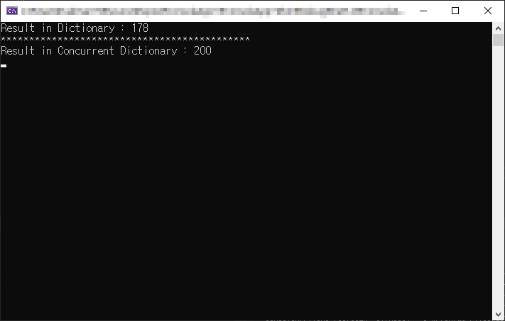 Console.WriteLine(string.Format("Result in Concurrent Dictionary : {0}", _mydictConcu.Values.Count));