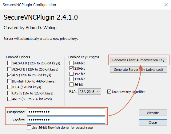 원격접속 암호를 입력후 Generate Client Authentication Key 버튼을 클릭합니다.