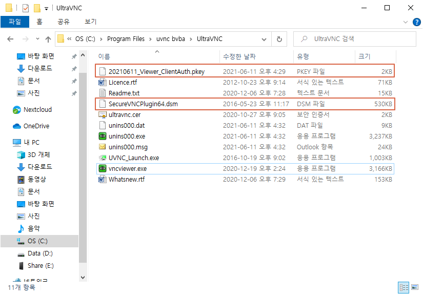 UltraVNC서버에서 생성한 Viewer키를 뷰어를 사용 컴퓨터에 복사후 아래 위치에 복사를 합니다.