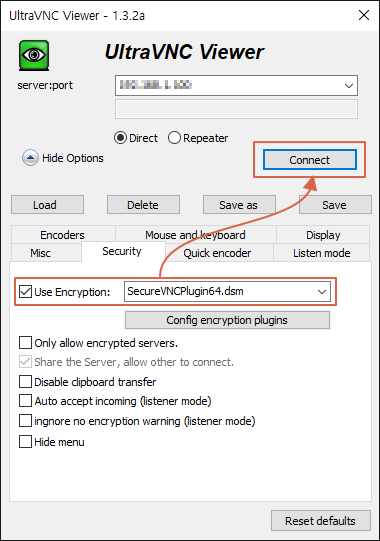 UltraVNC Viewer 실행후 Show Options 선택 -> Security -> Use Encryption 체크 -> SecureVNCPlugin64.dsm 선택 -> 주소입력 -> Connect