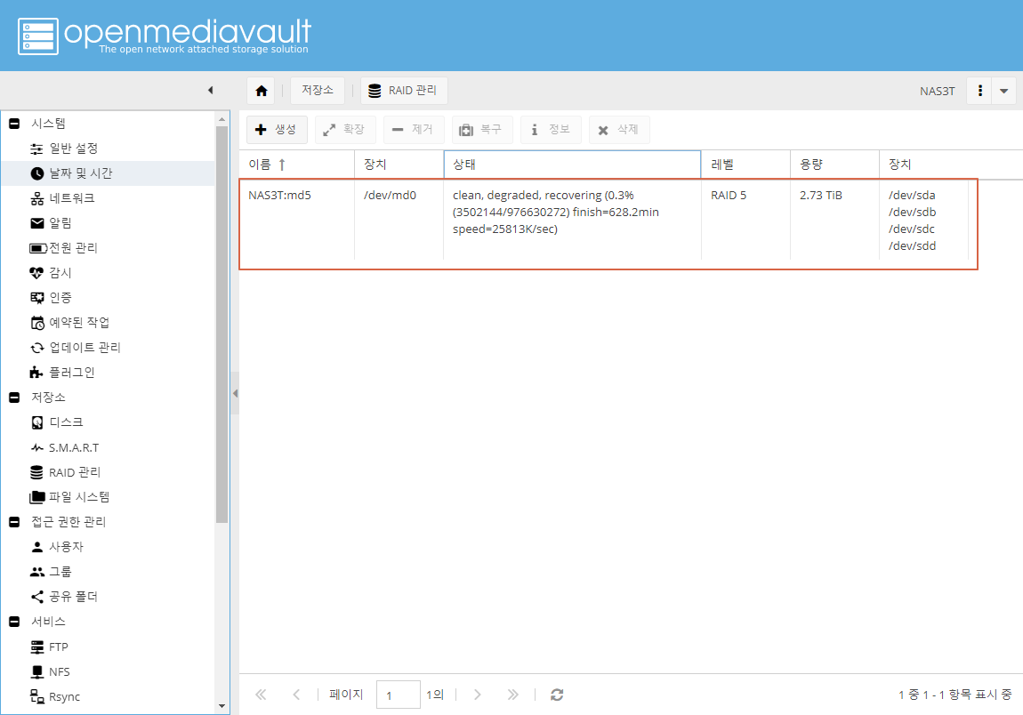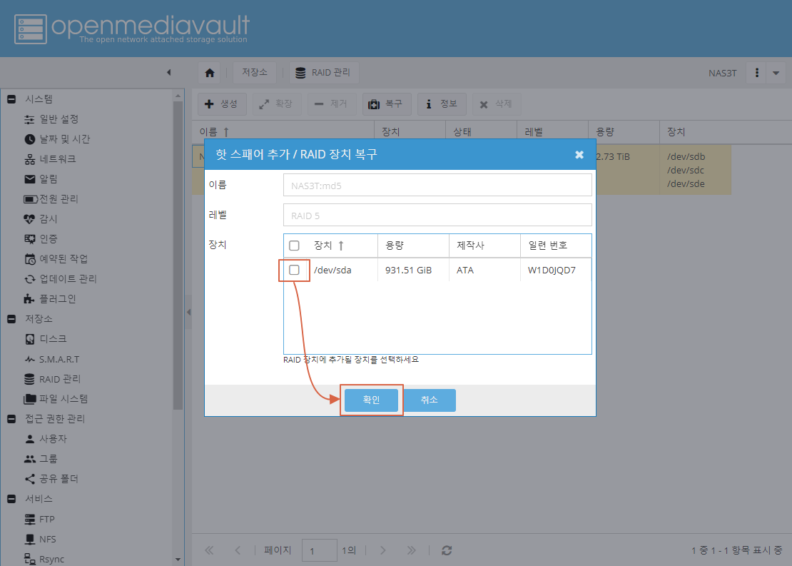 저장소 -> RAID관리 -> 레이드 선택 -> 복구 버튼 클릭