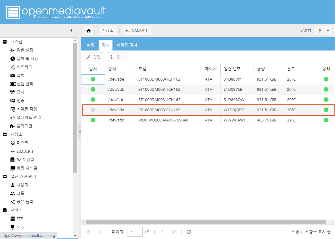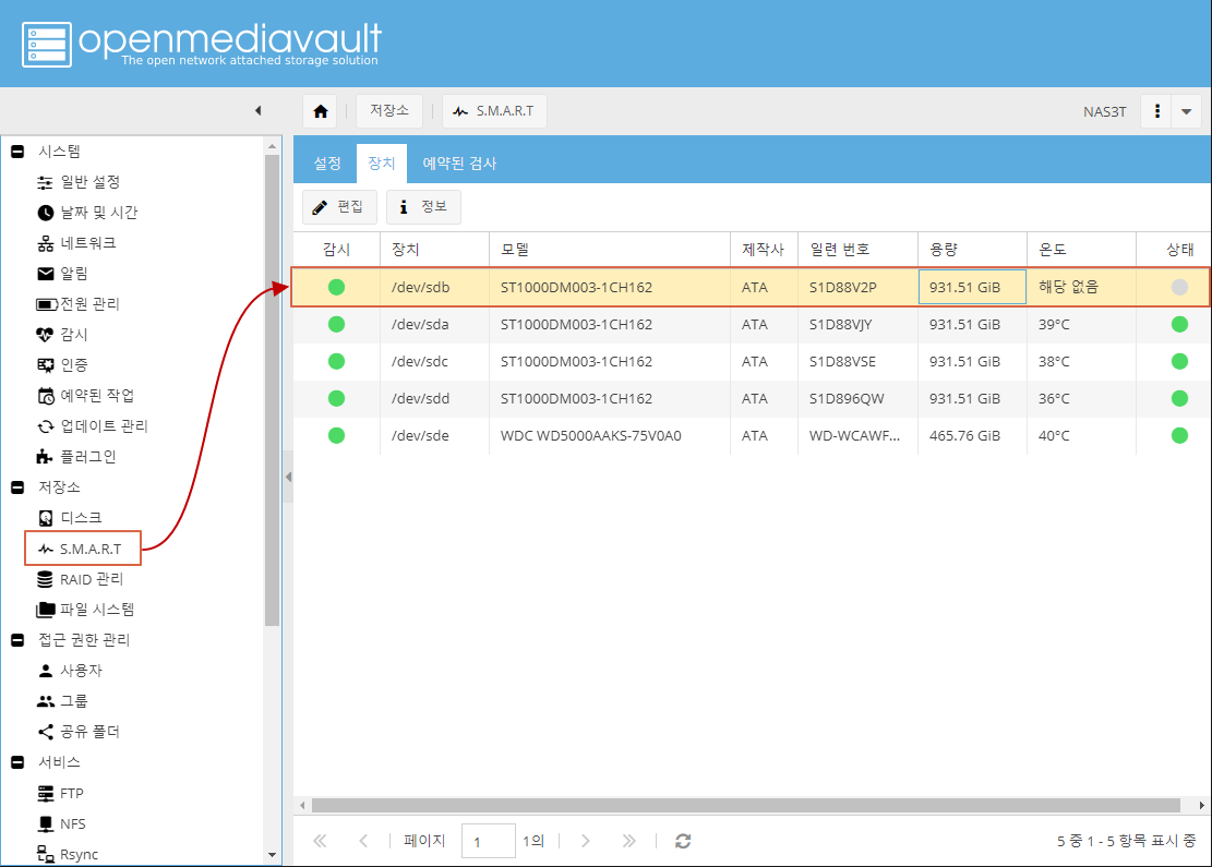 저장소 -> S.M.A.R.T 보시면 /dev/sdb 상태가 알수 없음을 확인할수 있습니다.