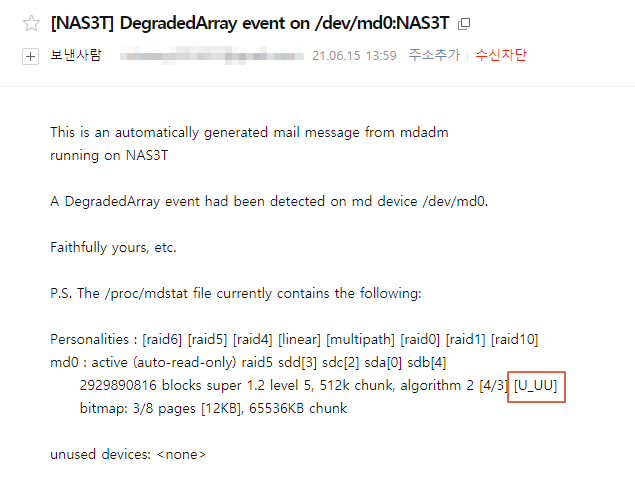 디스크 제거된 상황을 알려주는 메일이 왔습니다. [U_UU]