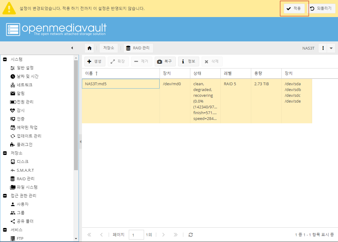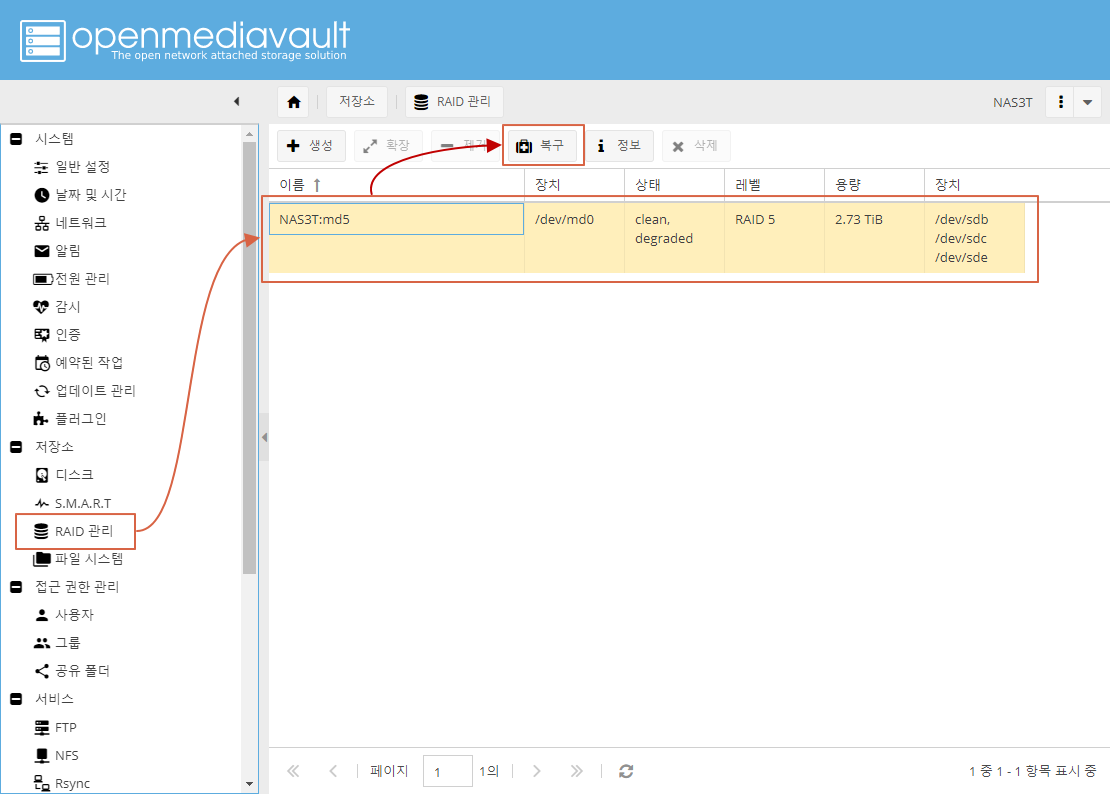 저장소 -> RAID관리 -> 레이드 선택 -> 복구 버튼 클릭