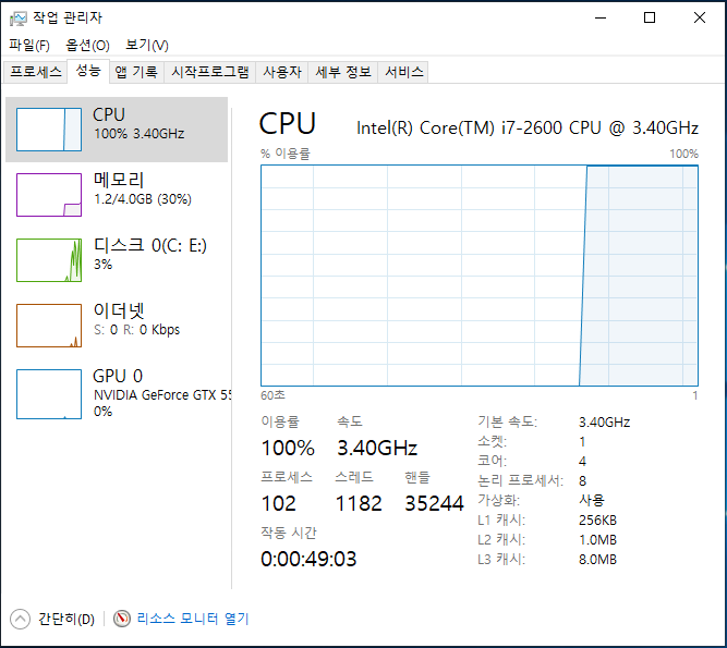 윈도우10 설치시 CPU점유율이 100%에서 내려오지 않습니다.
