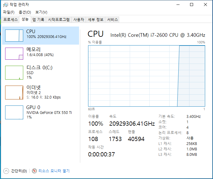 CPU 3.40GHz를 이상하게 표기합니다. 20929306.41GHz