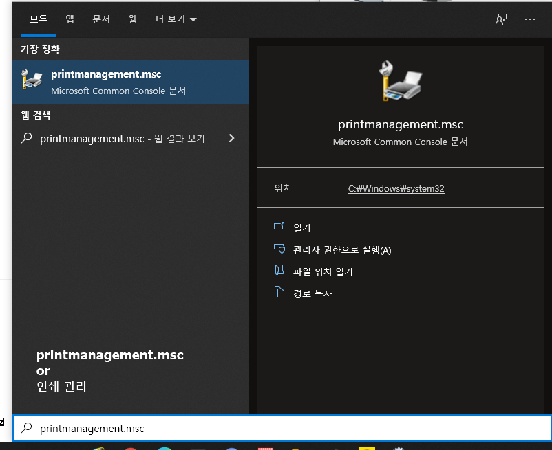 WIN+S -> printmanagement.msc(인쇄 관리)