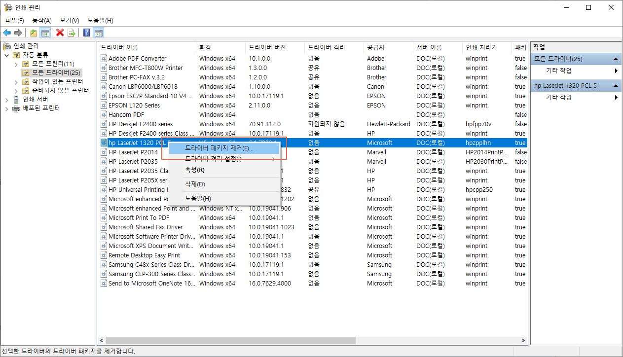 5. 인쇄 관리 -> 프린터 선택 -> 드라이버 패키지 제거