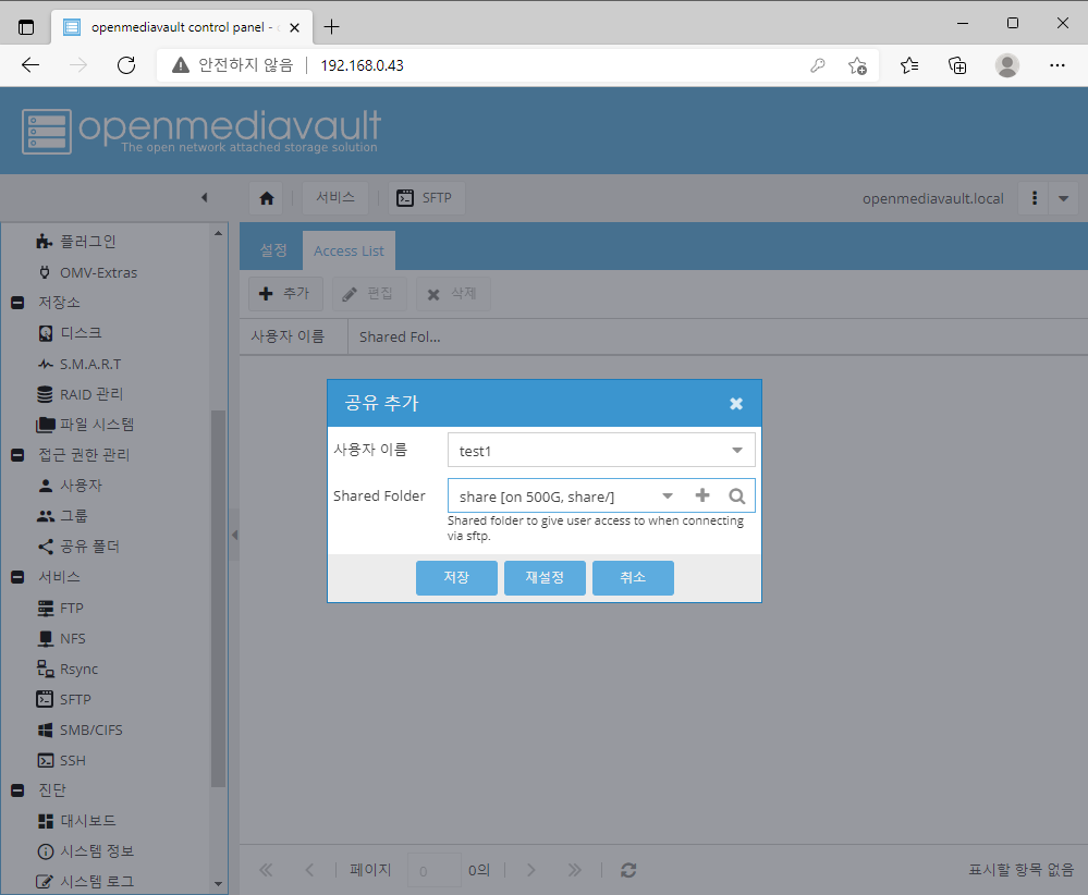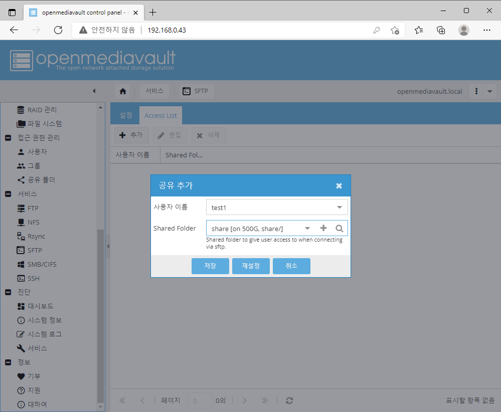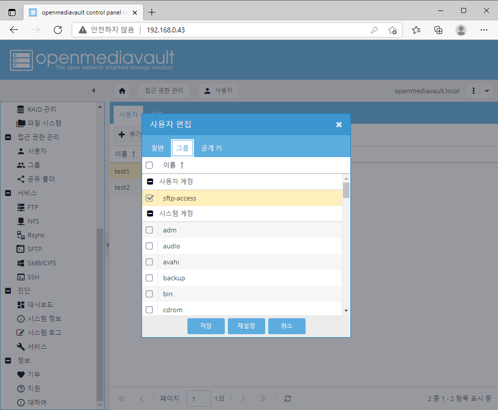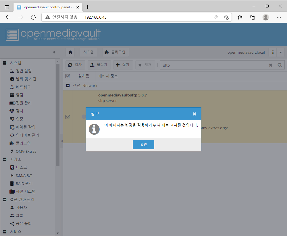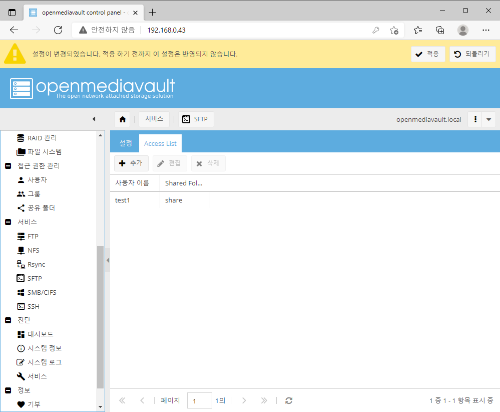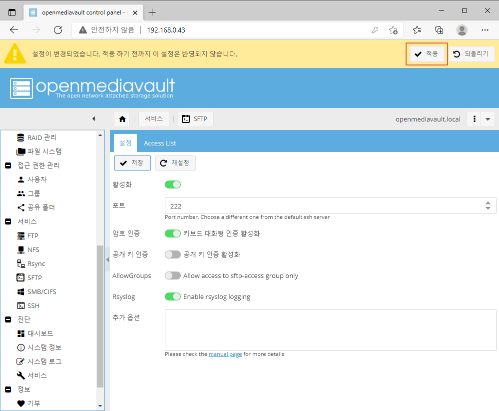 SFTP클라이언트 접속테스트시 적용이 되지 않을경우 OMV를 리부팅하면 됩니다.