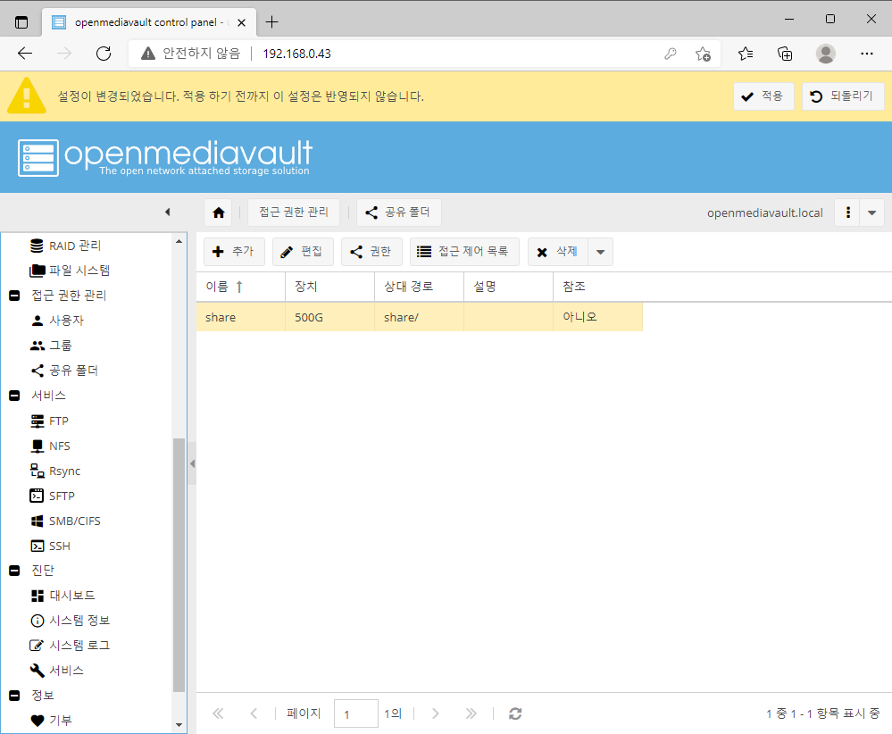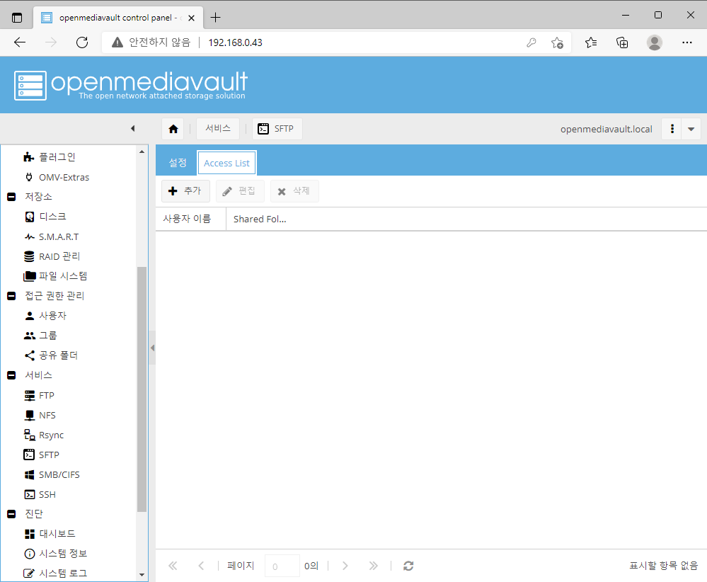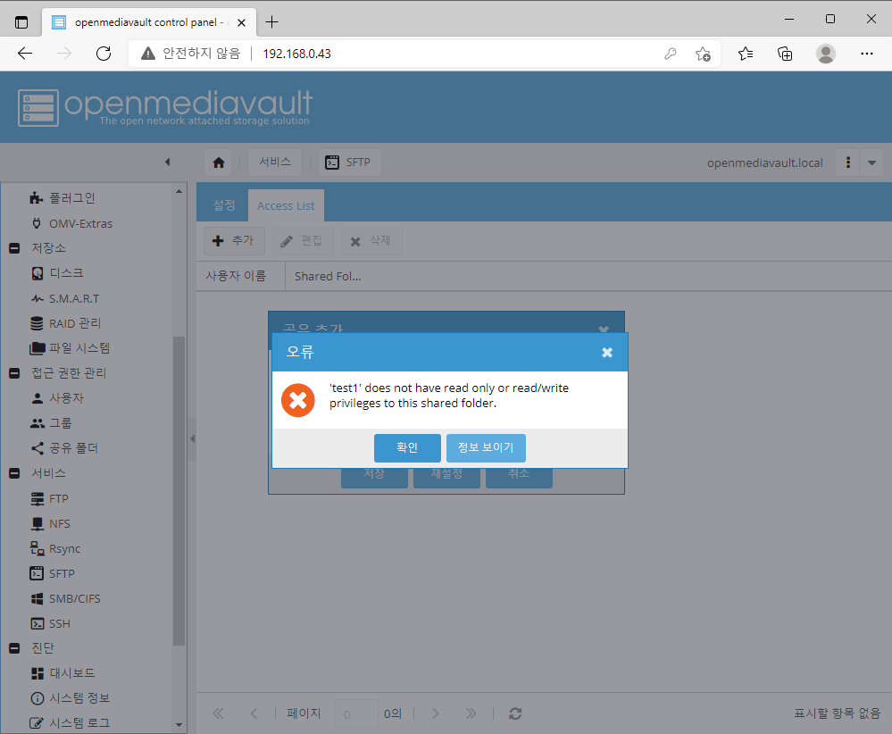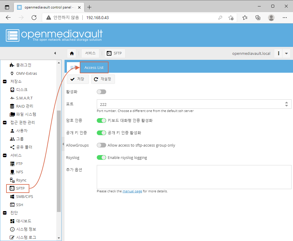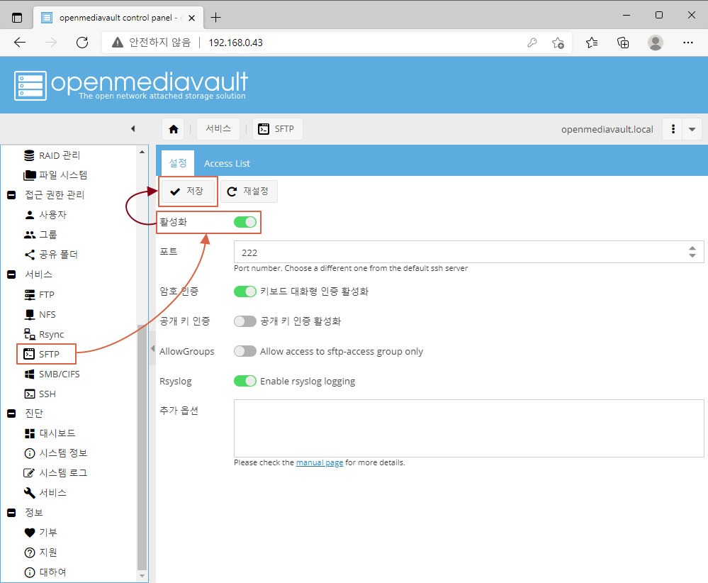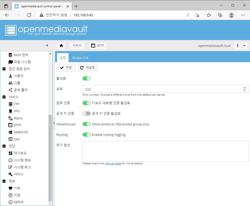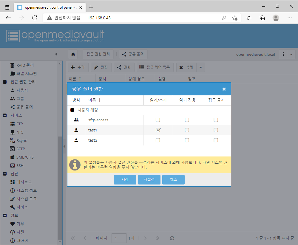 SFTP클라이언트 접속테스트시 적용이 되지 않을경우 OMV를 리부팅하면 됩니다.