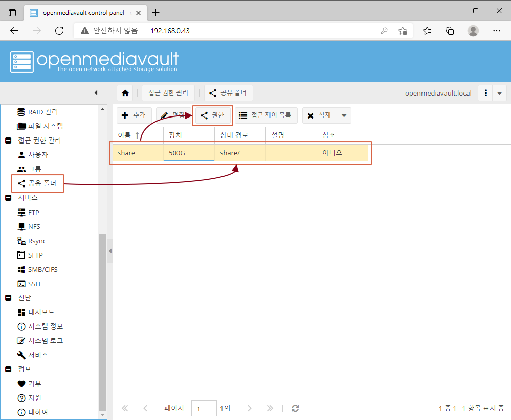 공유 폴더 -> 권한 -> 계정 -> 읽기/쓰기 설정