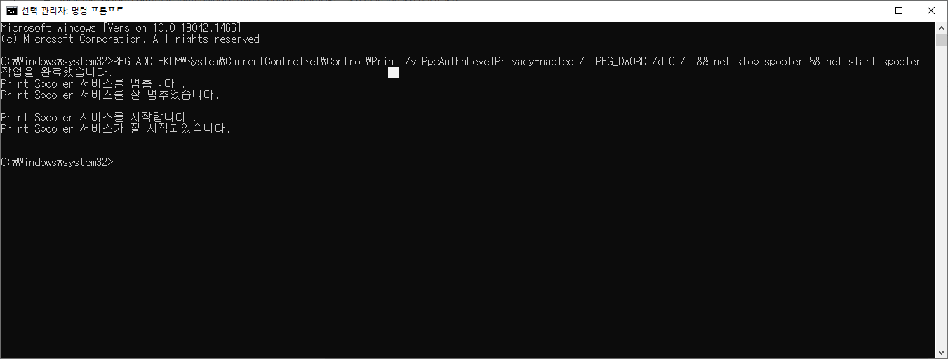 REG ADD HKLM\System\CurrentControlSet\Control\Print /v RpcAuthnLevelPrivacyEnabled /t REG_DWORD /d 0 /f && net stop spooler && net start spooler