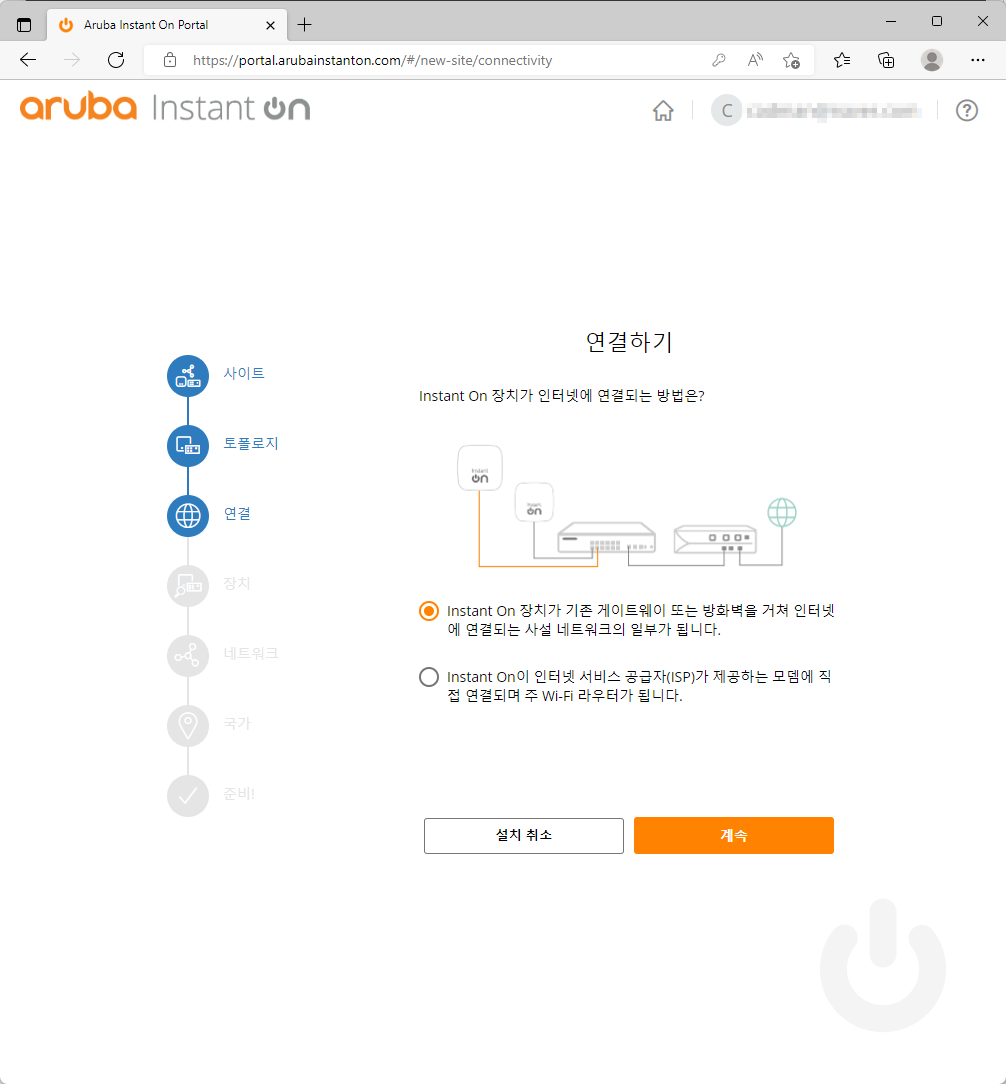 Instant On 장치가 기존 게이트웨이 또는 방화벽을 거쳐 인터넷에 연결되는 사설 네트워크 일부가 됩니다.