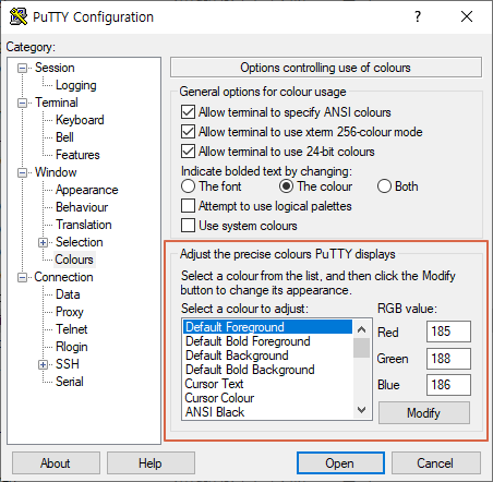 PuTTY Session Default Settings부분의 디스플레이 색상을 레지스트리값으로 변경하는 방식입니다.