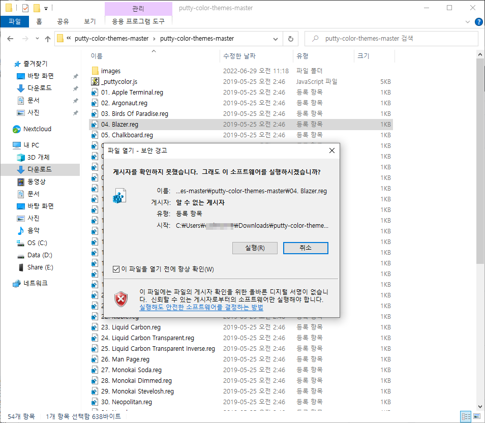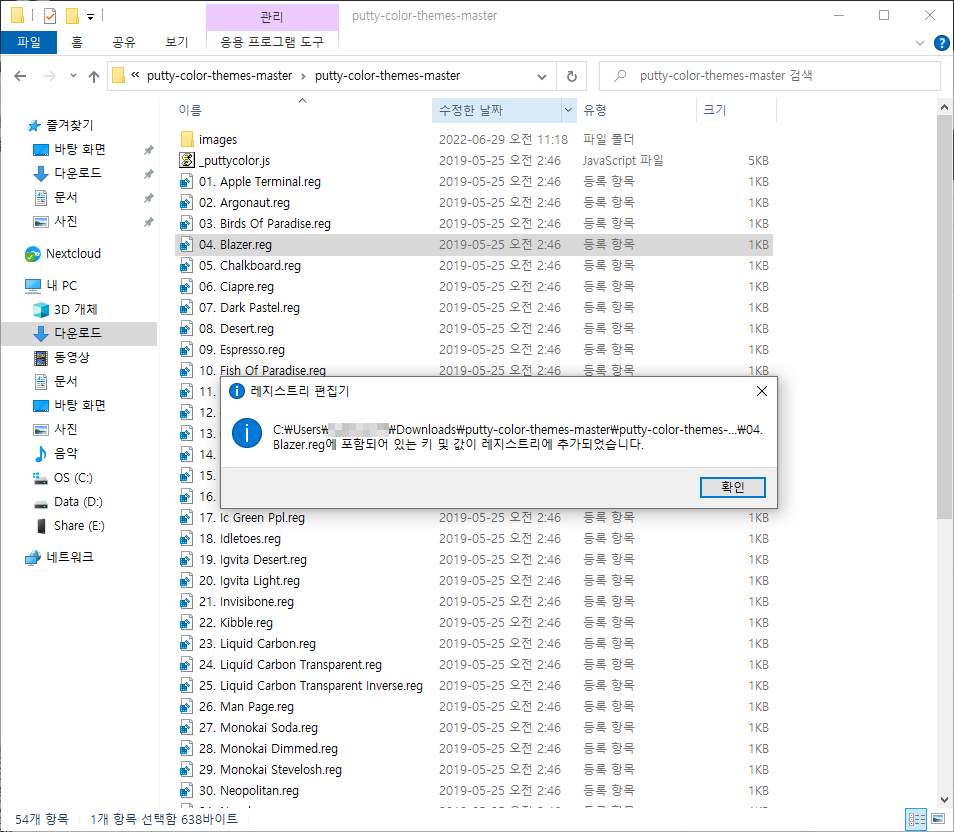 4. 선택하신 테마에 맞는 레지스트리 파일을 실행합니다.
