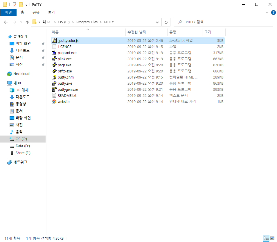 3. _puttycolor.js 파일을 PuTTY 설치된 폴더로 복사를 합니다. (c:\Program Files\PuTTY\)